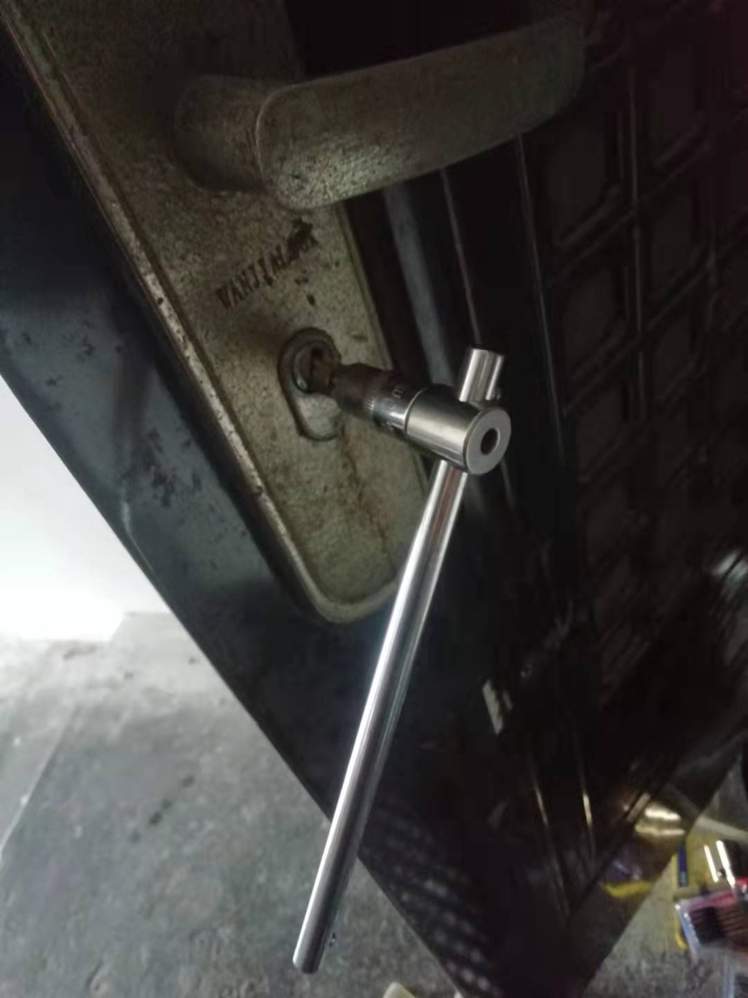 从工具包里找到超B级锁专用万能钥匙...上好锡纸..插进锁孔 秒开....